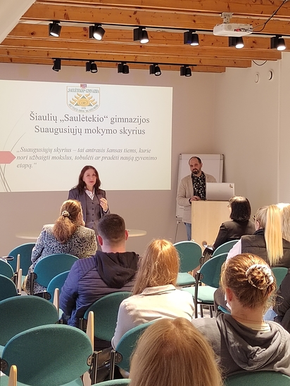 2026 m. kovo 17 d. Šiaulių Užimtumo tarnybos skyriuje vyko Šiaulių „Saulėtekio“ gimnazijos administracijos susitikimas su tarnybos klientais ir darbuotojais. Susitikimo metu gimnazijos direktorė Jūratė Rimkuvienė ir Suaugusiųjų mokymo skyriaus vedėjas Saulius Juška pristatė Suaugusiųjų mokymo skyriuje siūlomas mokymosi galimybes, mokymosi formas, sąlygas ir priėmimo tvarką. Dalyviai turėjo galimybę užduoti klausimus ir gavo išsamius atsakymus. Taip pat buvo aptartos mokinių perspektyvos baigus mokslus gimnazijoje: tolimesnis mokymasis, profesinis tobulėjimas ir įsidarbinimo galimybės. Susitikimo dalyviams apie švietimo galimybes suteikta aiški informacija, skatinanti svarstyti sugrįžimą į mokymosi procesą bei kvalifikacijos kėlimą. NUOTRAUKOS>>>