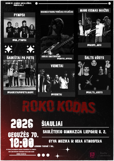 Kviečiame į energingą ir gyvo garso kupiną koncertą „Roko kodas“ – Vilniaus universiteto Šiaulių akademijos Muzikos pedagogikos studento Roko Šmatavičiaus baigiamojo bakalauro darbo meninį projektą!