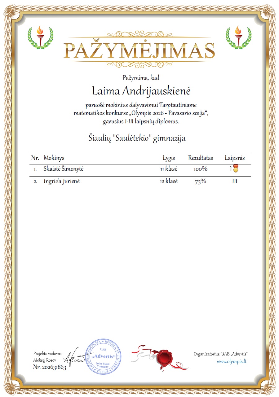 2026 m. kovo 1 d. – kovo 31 d. vykusiame Tarptautiniame edukaciniame konkurse „Olympis 2026 – Pavasario sesija“ „Saulėtekio“ gimnazijos suaugusiųjų skyriaus IIIs klasės mokinė Skaistė Šimonytė apdovanota I laipsnio diplomu su medaliu, o IVs klasės mokinė Ingrida Jurienė pelnė II laipsnio diplomą. Mokines konkursui ruošė matematikos mokytoja Laima Andrijauskienė. |