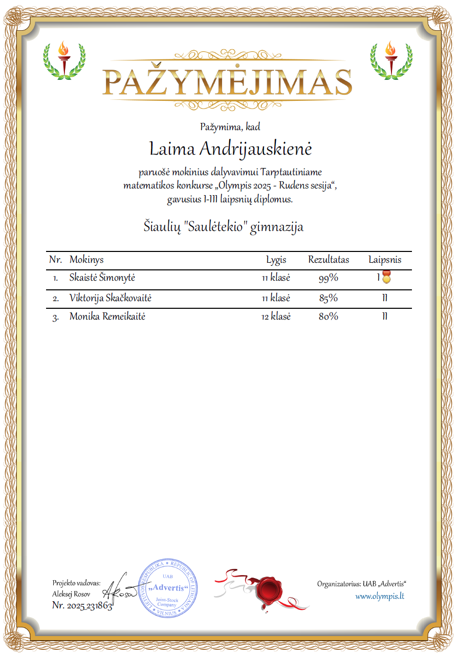 2025 m. lapkričio 1 d. – lapkričio 30 d. vykusiame Tarptautiniame edukaciniame konkurse „Olympis 2025 - Rudens sesija“ „Saulėtekio“ gimnazijos suaugusiųjų skyriaus IIIs klasės mokinė Skaistė Šimonytė apdovanota I laipsnio diplomu su medaliu, o IIIs klasės mokinė Viktorija Skačkovaitė bei IVs klasės mokinė Monika Remeikaitė pelnė II laipsnio diplomus. Mokines konkursui ruošė matematikos mokytoja Laima Andrijauskienė. |
