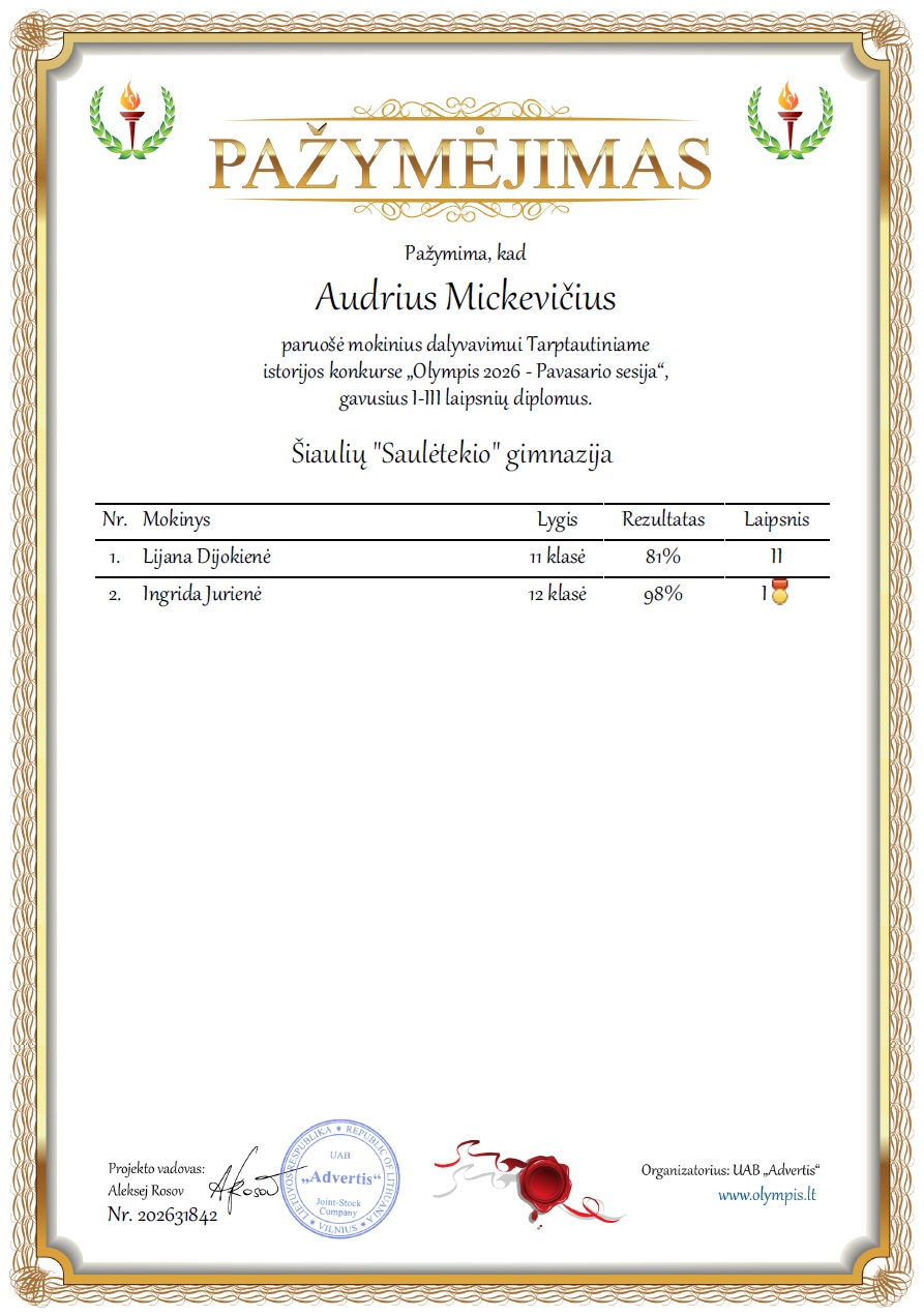 2026 m. kovo 1 d. – kovo 31 d. vykusiame Tarptautiniame edukaciniame konkurse „Olympis 2026 – Pavasario sesija“ „Saulėtekio“ gimnazijos suaugusiųjų mokymo skyriaus IVs klasės mokinė INGRIDA JURIENĖ apdovanota I laipsnio diplomu (istorijos mokytojas Audrius Mickevičius).